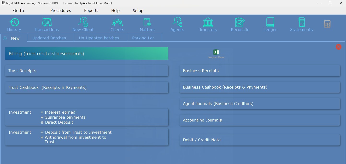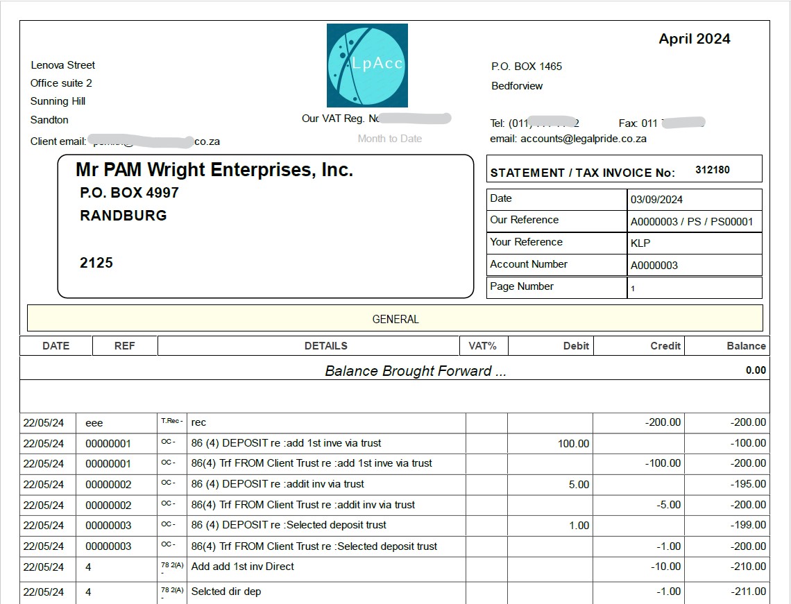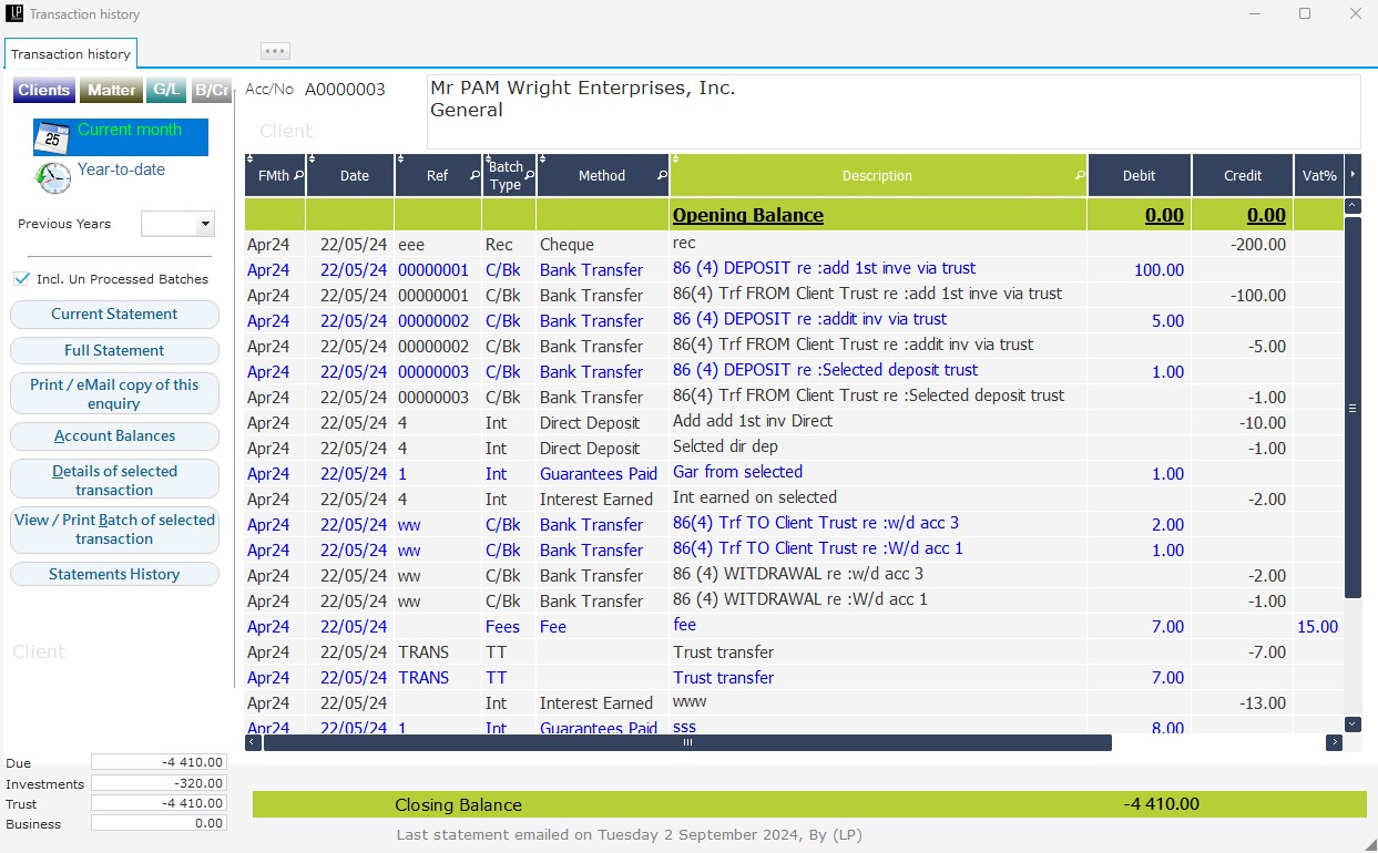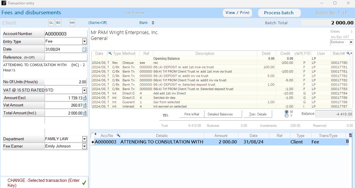 - Comprehensive Account Management: Effortlessly manage trust and business accounts, client ledgers, creditors, investments, disbursements, and fees with customizable fee codes and rates.