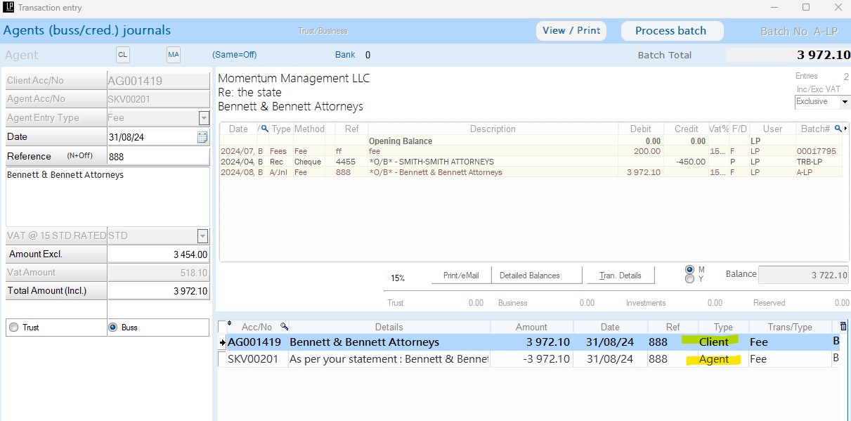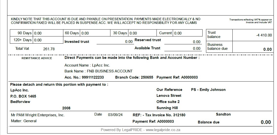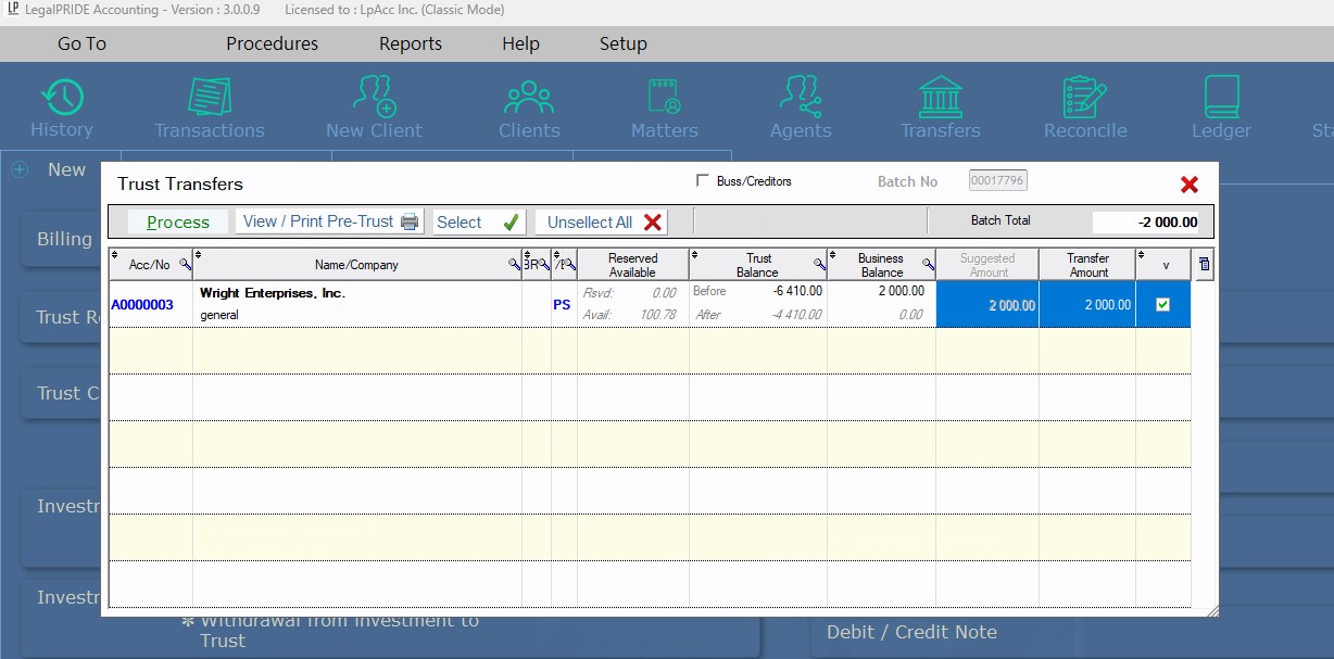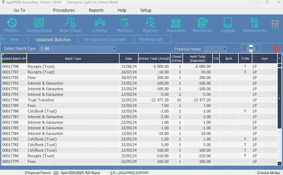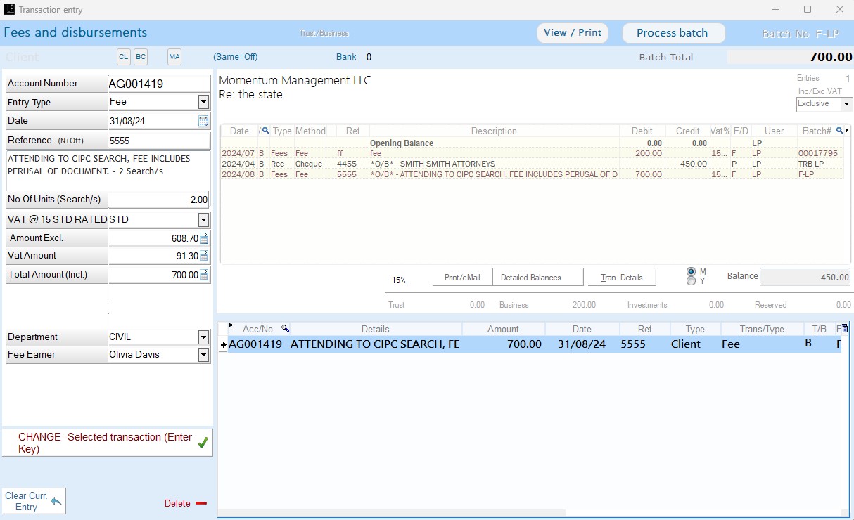 - Comprehensive Account Management: Effortlessly manage trust and business accounts, client ledgers, creditors, investments, disbursements, and fees with customizable fee codes and rates.