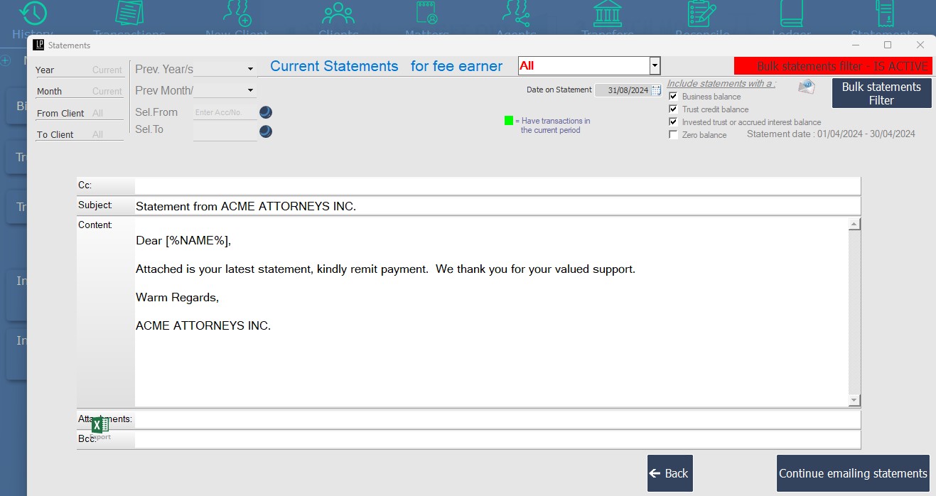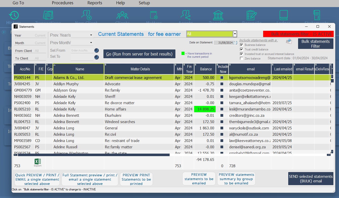 - Targeted Statement Selection: Filter statements by debit/credit balance or fee earner for precise, efficient distribution.