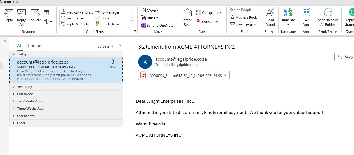 - Organized Email Tracking: Access a searchable, chronological log of sent statements, filterable by send result, text, or fee earner.